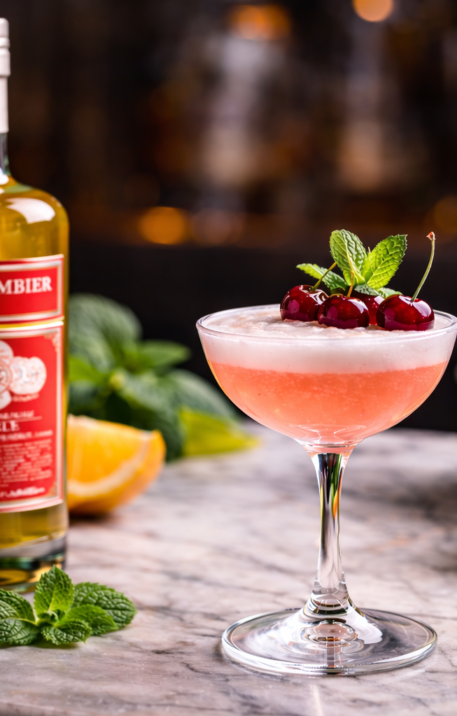 Un cocktail vif et élégant où l’intensité herbacée de l’Elixir se mêle à la fraîcheur du gin, sublimée par la gourmandise du Cherry Brandy et réveillée par une pointe de citron. Un équilibre subtil entre fraîcheur acidulée, notes florales et fruitées.