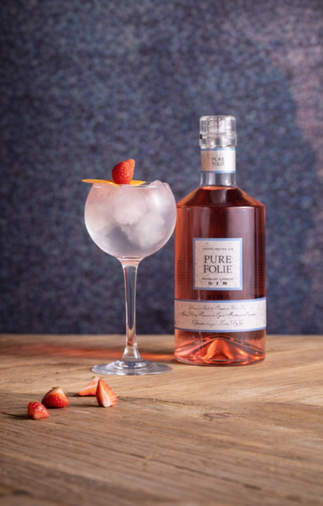 Versez le Gin Pure Folie et le tonic et décorez avec une petite fraise